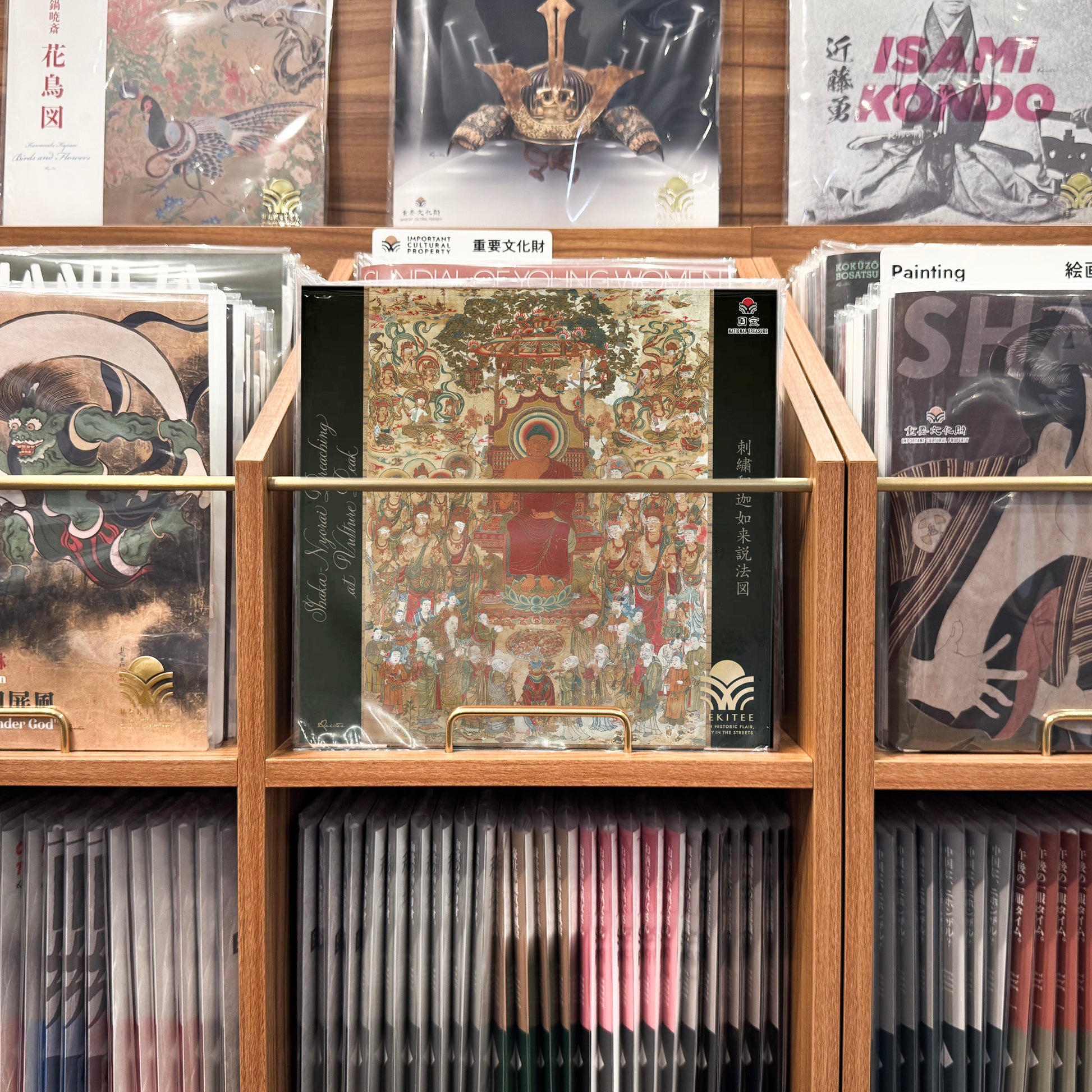 This embroidered Buddhist image from the 8th century is the largest surviving example of its kind in Japan. Created for memorial and devotional purposes, it depicts the Buddha giving a sermon, surrounded symmetrically by bodhisattvas, monks, devotees, and celestial beings. The use of colorful threads and fine stitching to express texture is especially notable.