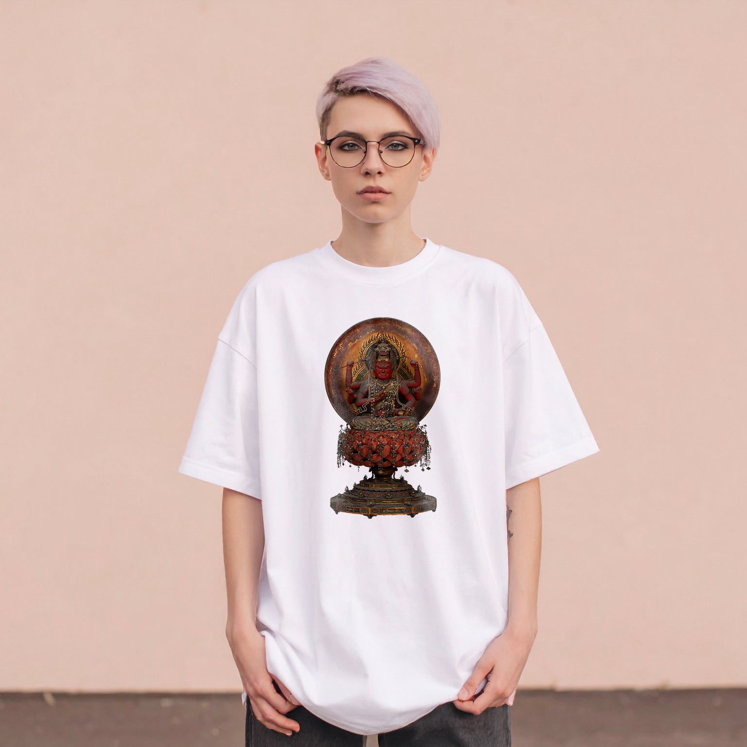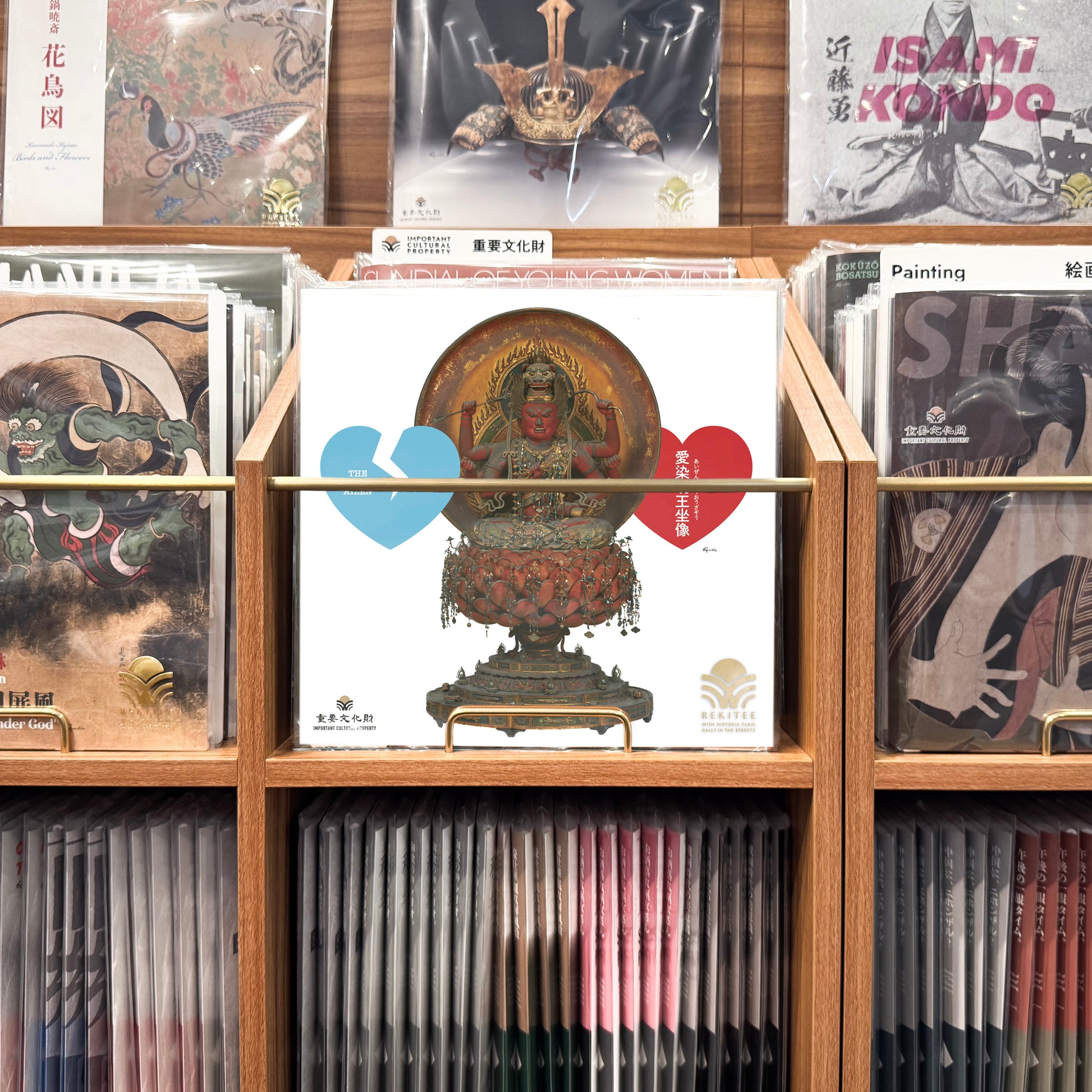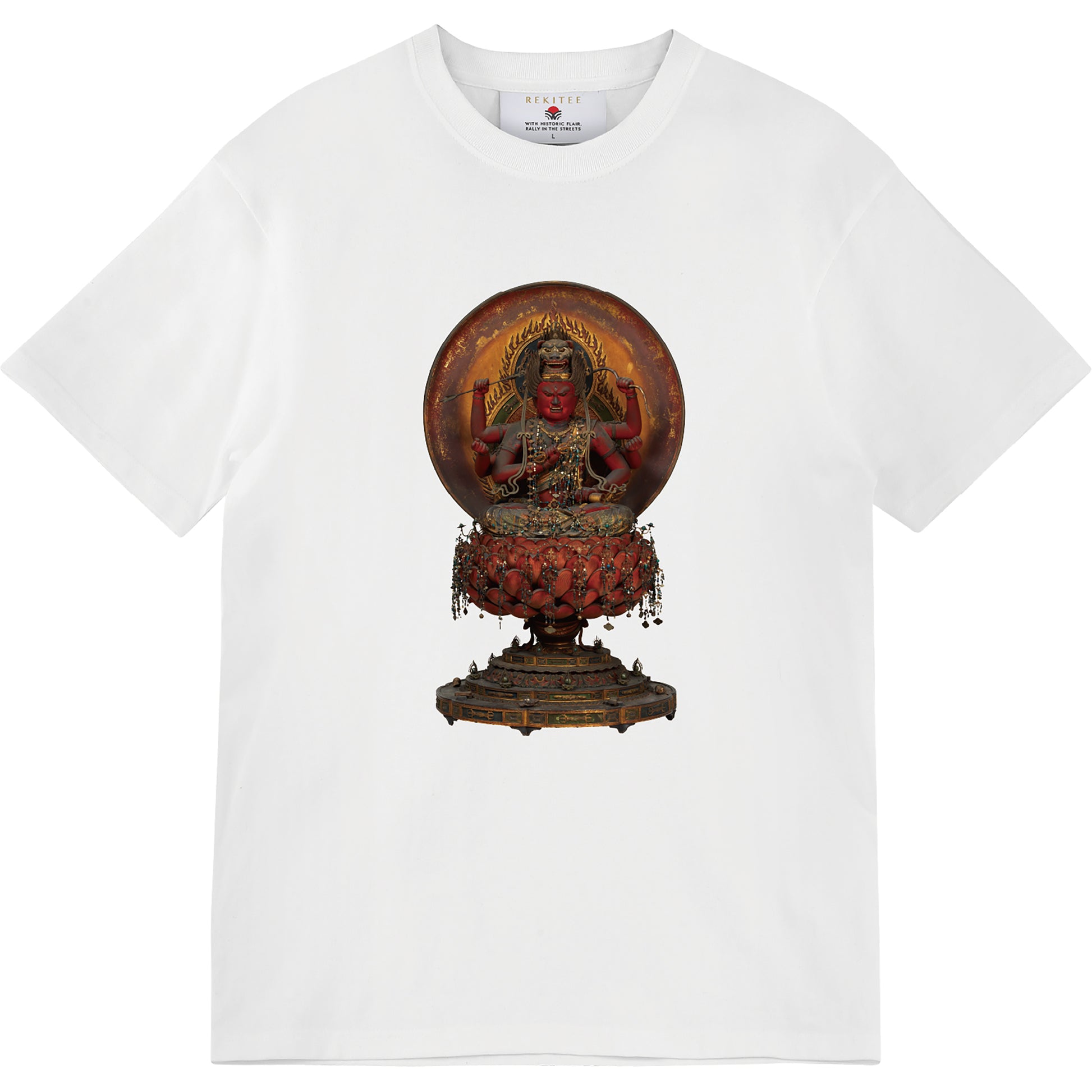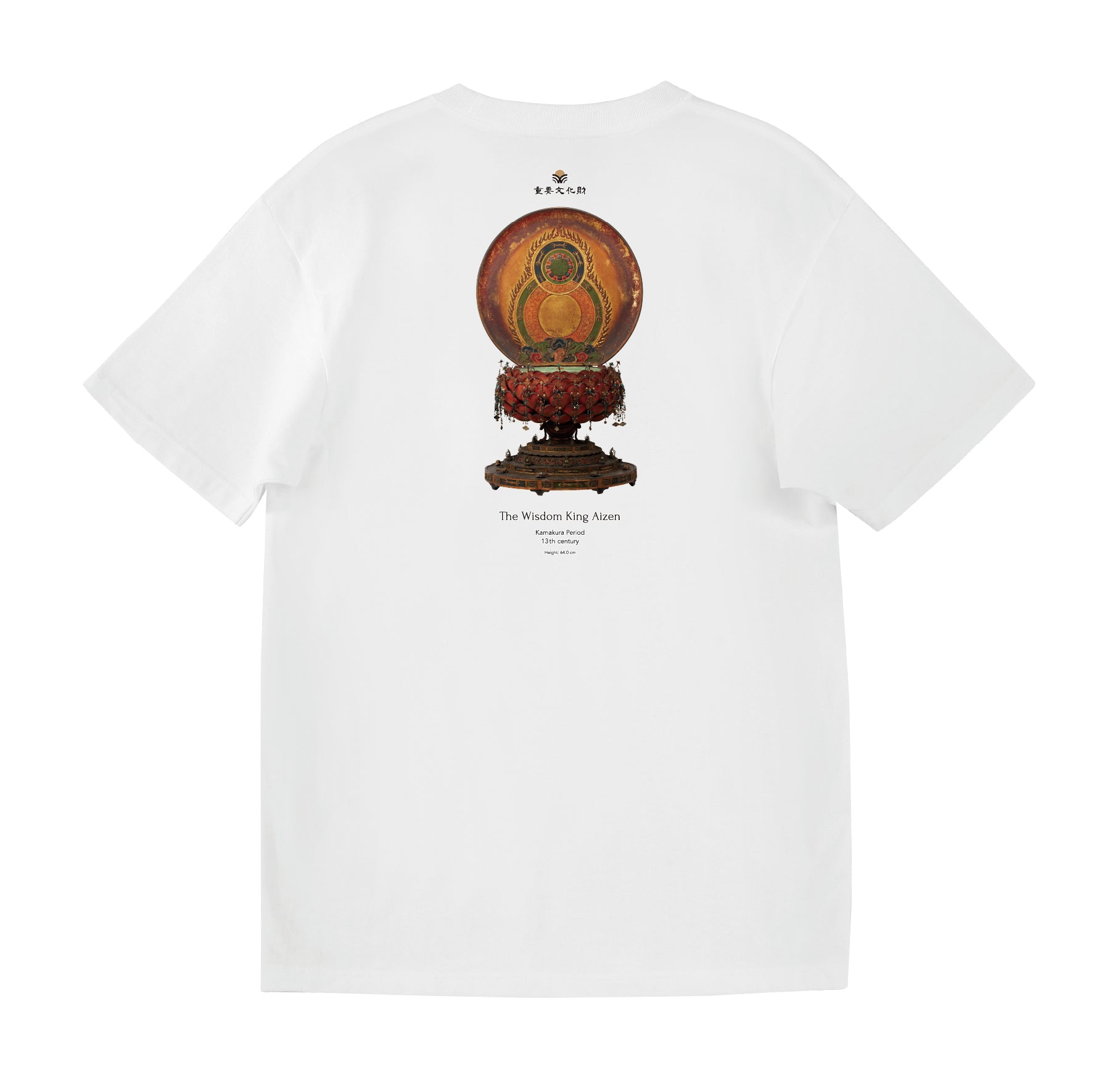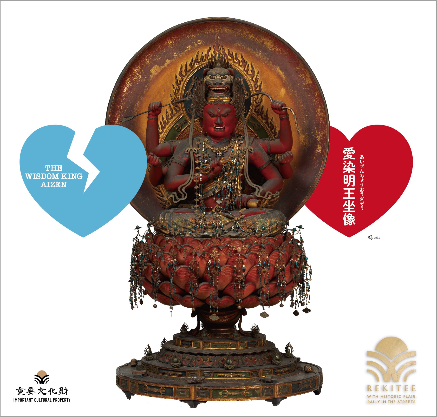 The Wisdom King Aizen is a guardian deity who converts those who defy Buddhist teachings. He is a fearsome figure with six arms and a crimson body, seated on a lotus flower that blooms above a vase. It is also characteristic that he carries a bow and arrow. Despite his wrathful expression, he is believed to be beneficial for love and matchmaking, and is also believed to be the protector of dyeing and weaving.