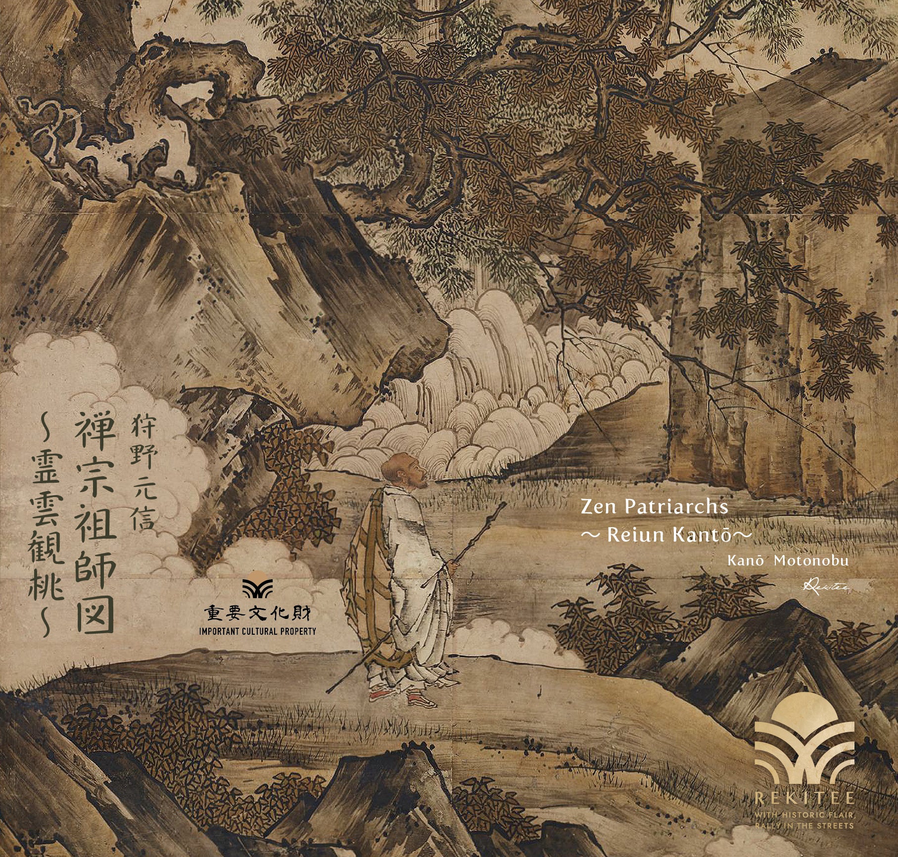 This painting illustrates a story of Zen monks from the Tang dynasty. It is based on the tale of the monk Reiun, who attained sudden enlightenment upon seeing peach blossoms in bloom. The composition is striking, featuring a grand waterfall at its center and the solitary figure of the monk standing amidst rugged cliffs.