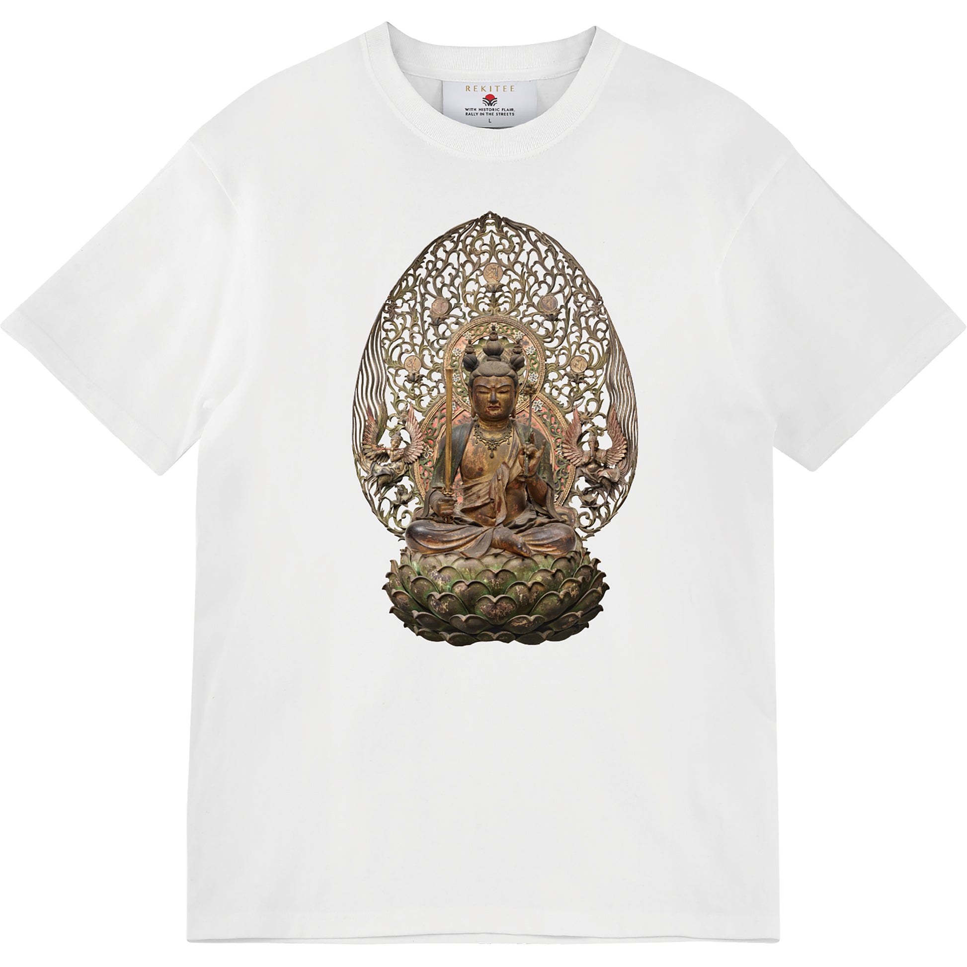 Monju Bosatsu, the Bodhisattva of Wisdom, is depicted with five knots in his hair, symbolizing pure, childlike wisdom. The pedestal is decorated with wave patterns, reflecting a uniquely Japanese interpretation of "crossing the sea," a motif commonly associated with the pursuit of wisdom.